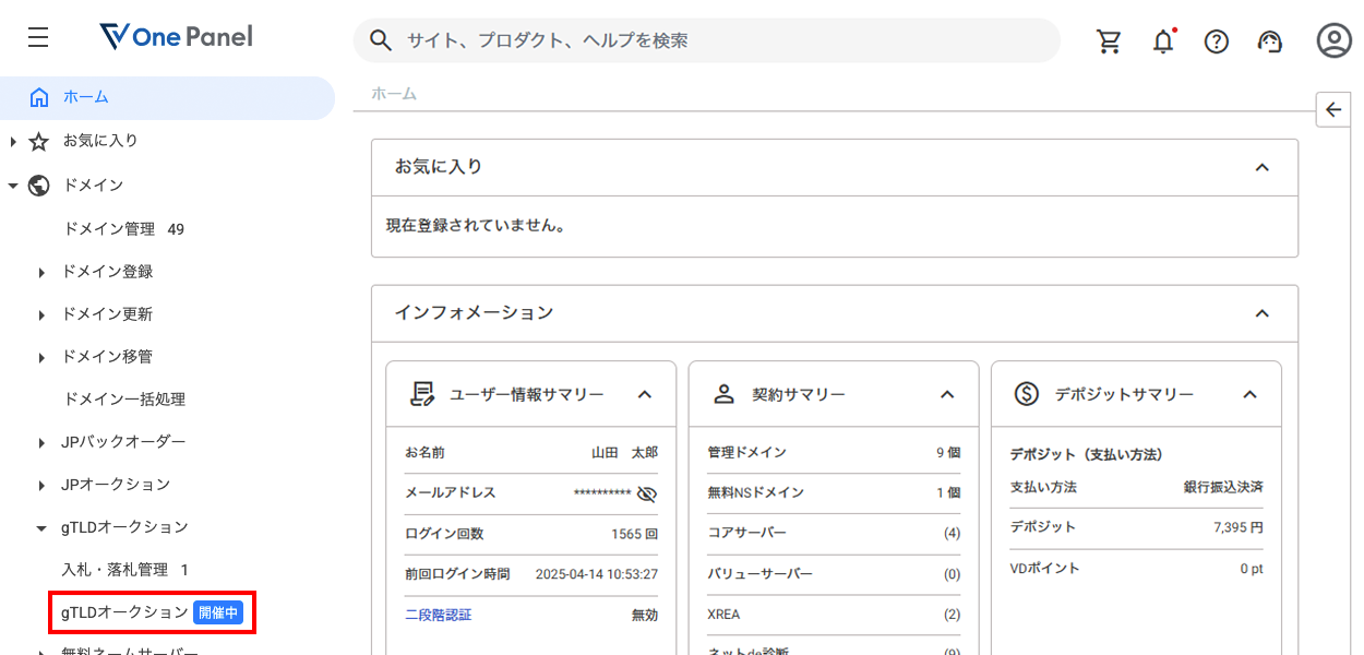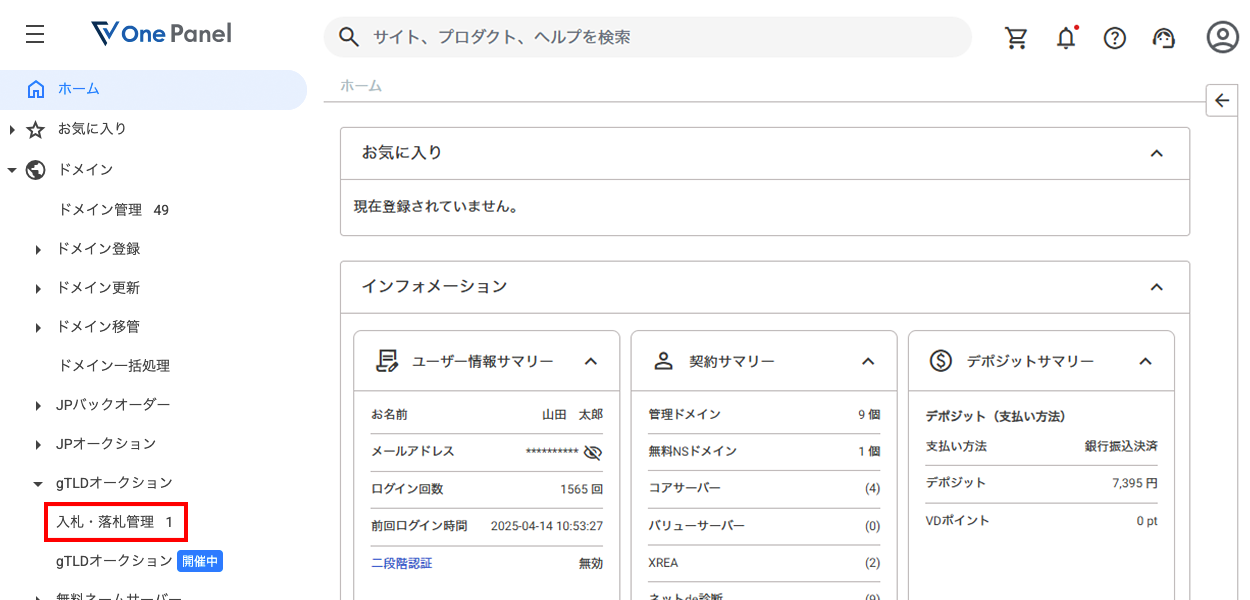 1.ホーム画面の「ドメイン」>「gTLDオークション」>「入札・落札管理」をクリックします。