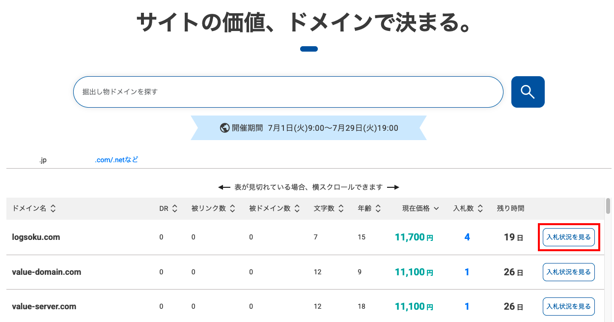 2.入札するドメインの横にある「入札状況を見る」をクリックします。
