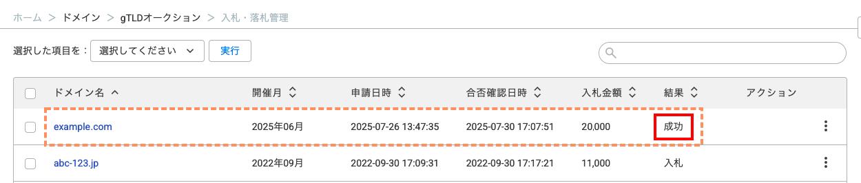 2.入札したドメイン名が落札できていると、結果に「成功」、もしくは「入金待ち」と表示されています。