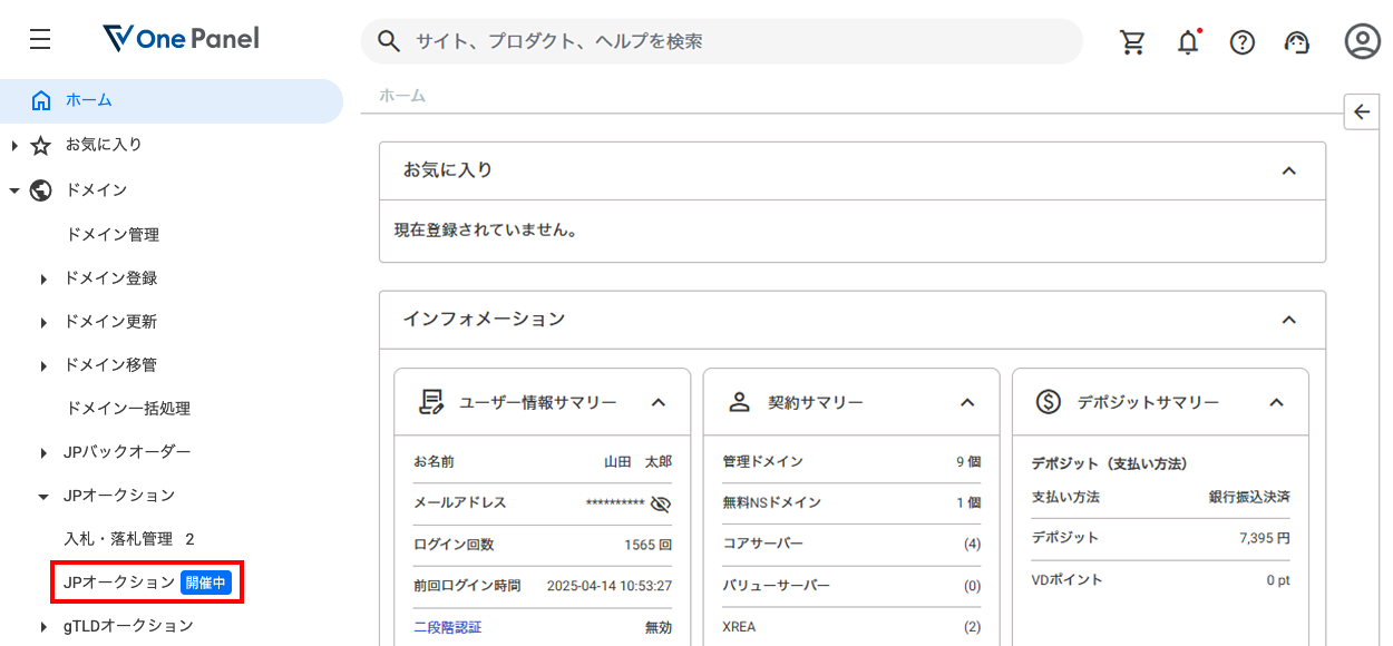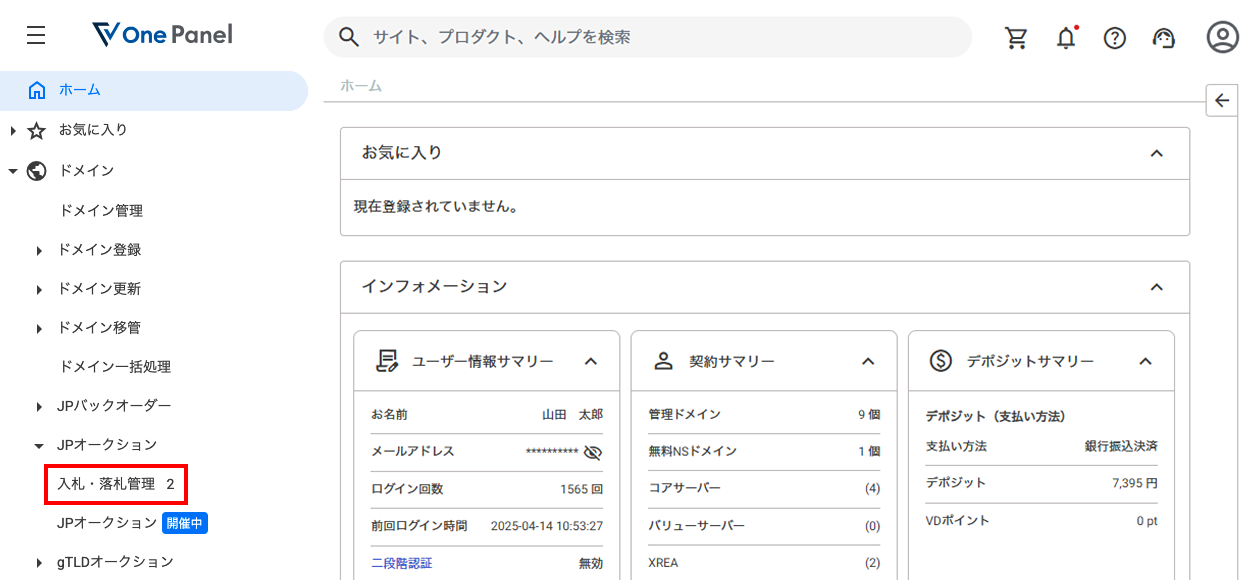 1.ホーム画面の「ドメイン」>「JPオークション」>「入札・落札管理」をクリックします。