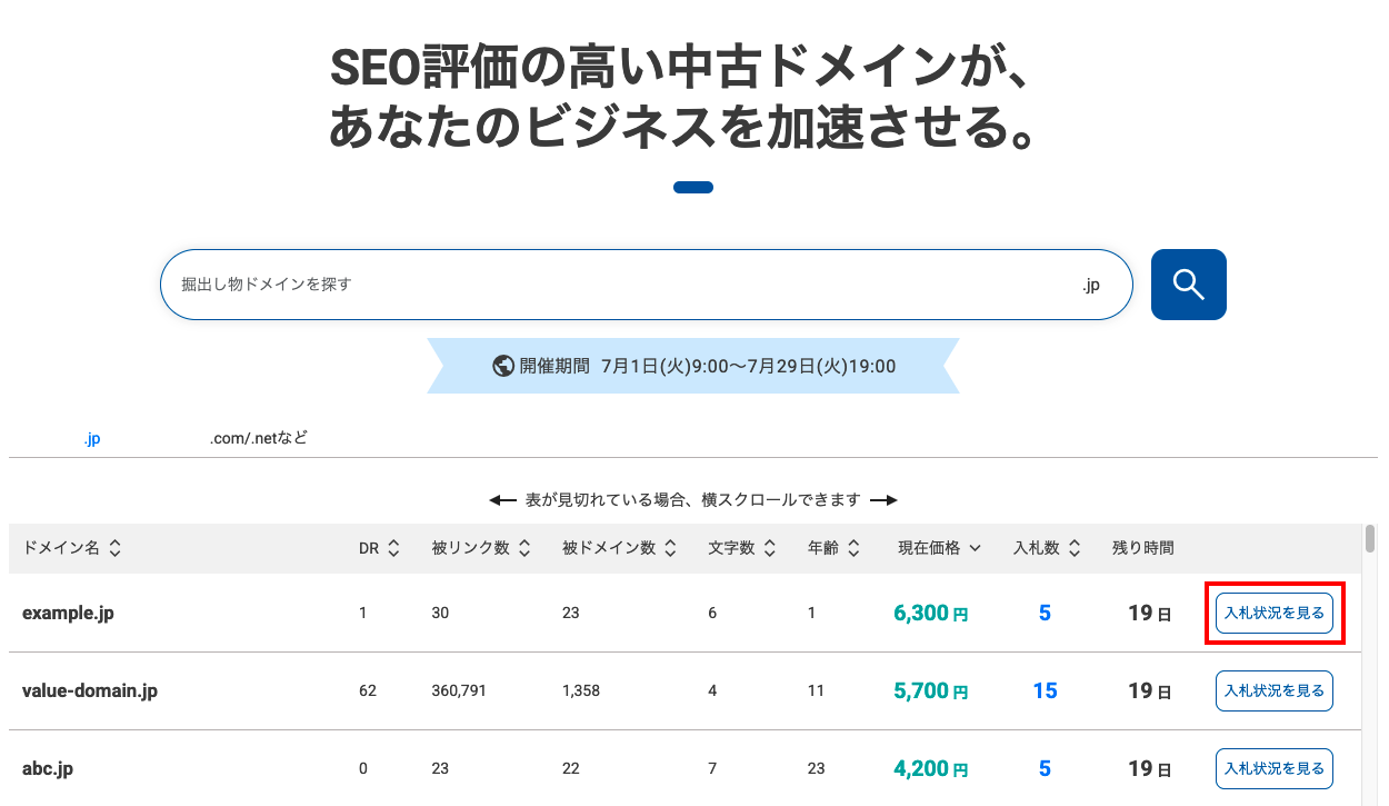 2.入札するドメインの横にある「入札状況を見る」をクリックします。
