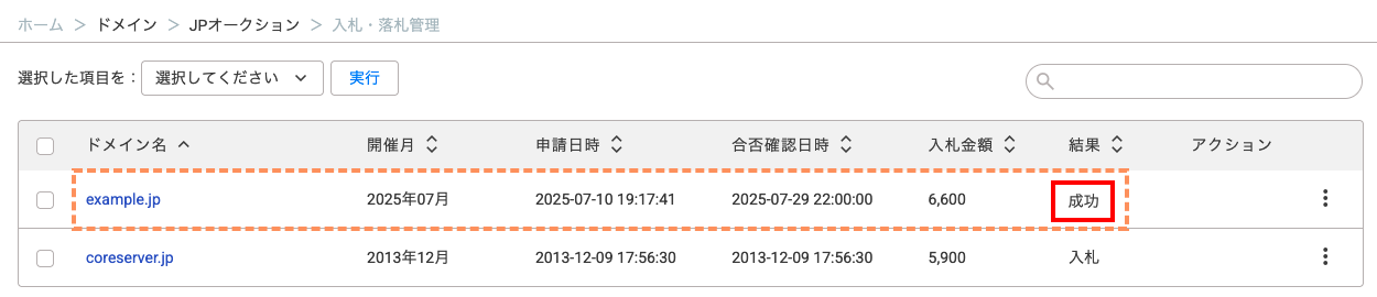 2.入札したドメイン名が落札できていると、結果に「成功」、もしくは「入金待ち」と表示されています。